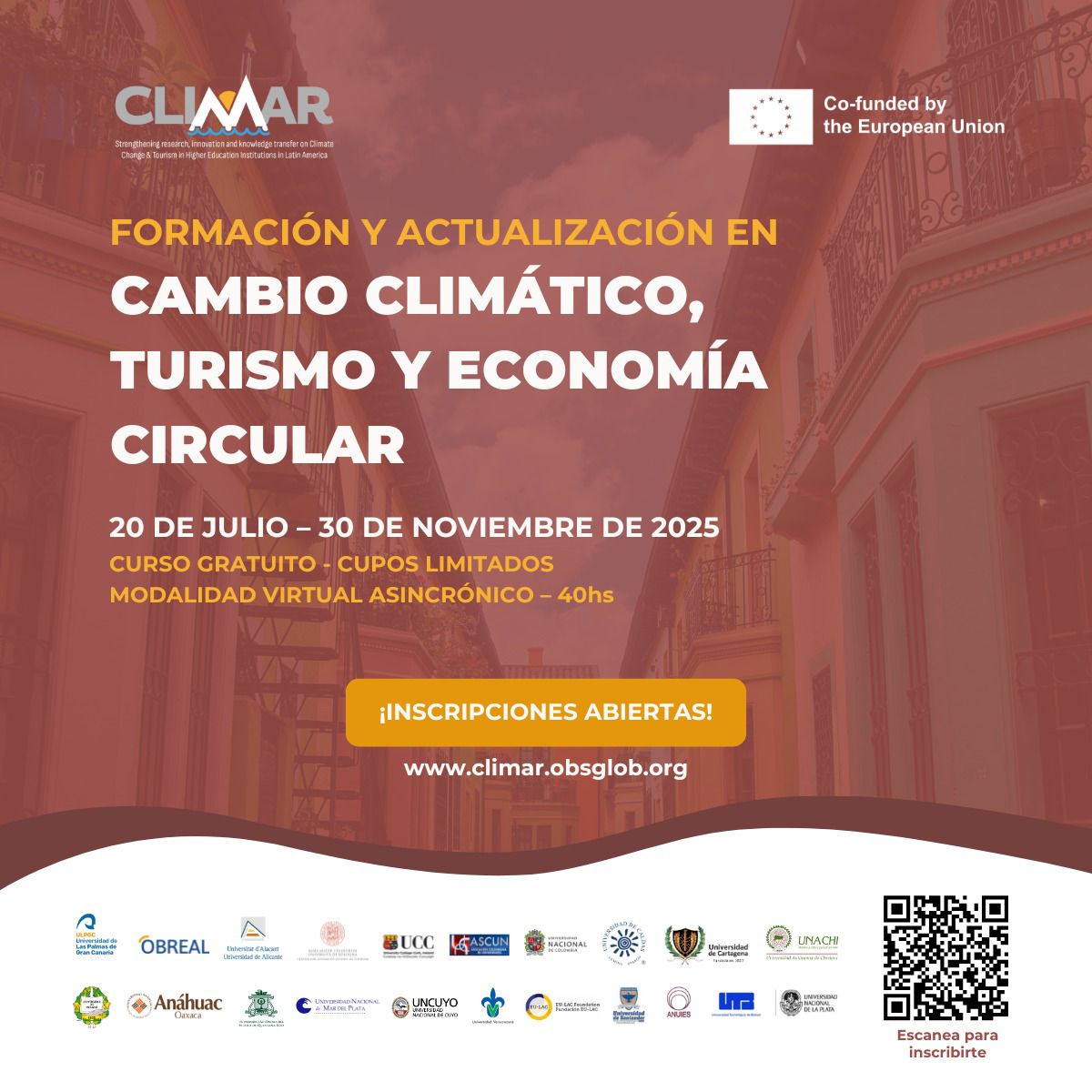 El taller se dictará en modalidad virtual, iniciando el 20 de julio de 2025 y finalizando el 30 de noviembre de 2025. El idioma del curso será español. Está dirigido a profesionales, gestores públicos, técnicos, docentes, estudiantes de formación avanzada y cualquier persona interesada en la sostenibilidad, el turismo y el cambio climático. Acá más detalles https://climar.obsglob.org/es/formacion-climar/