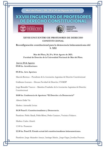 El acto de apertura contará con la presencia de Marcela Basterra, presidenta de la AADC; Guillermo Lorenzo, decano de la Facultad de Derecho de la UNMDP; y Jorge Reinaldo Vanossi, miembro fundador de la asociación. La conferencia inaugural, titulada “El Derecho a la Democracia”, estará a cargo del constitucionalista Alberto Dalla Vía.