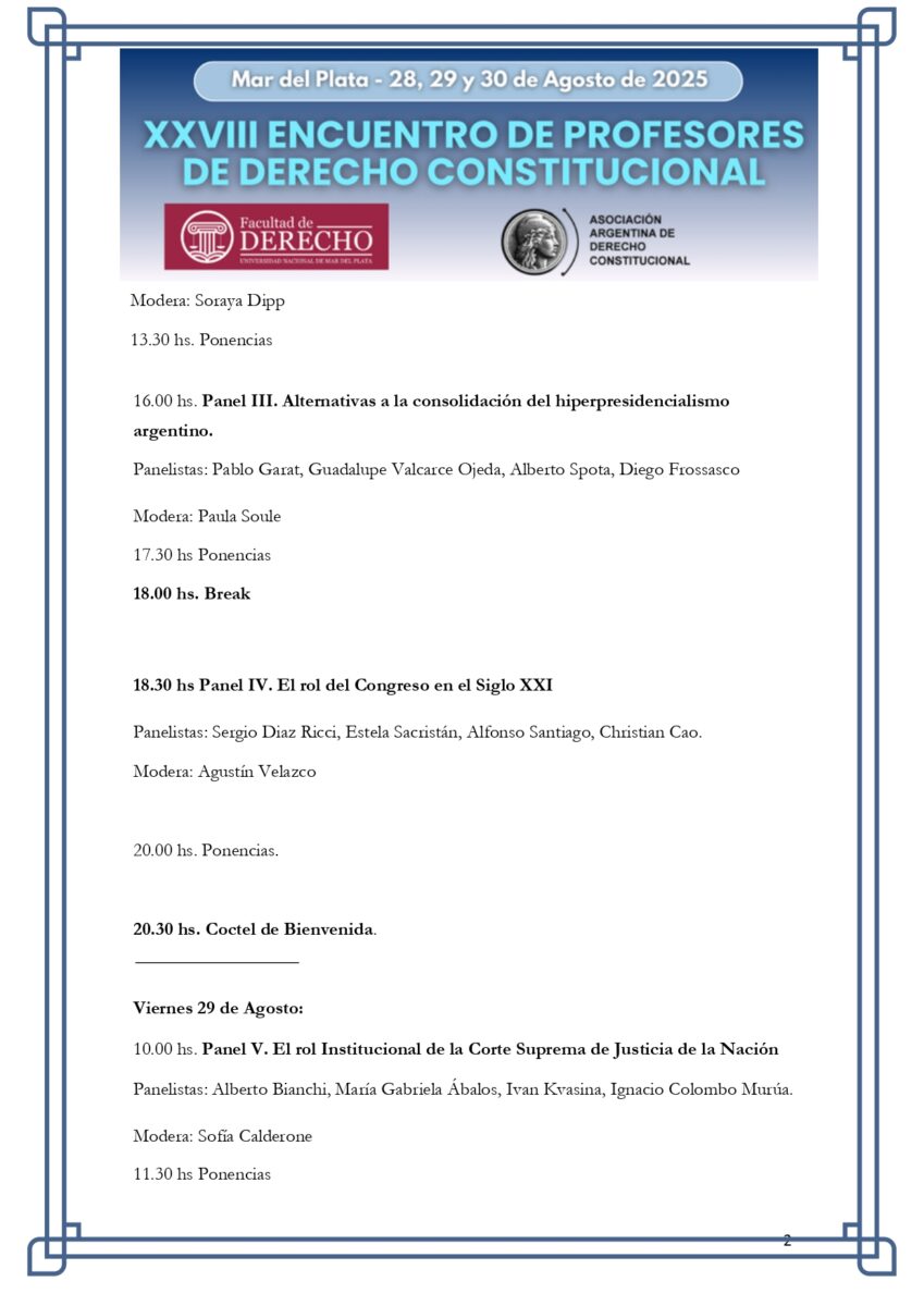 Ese mismo día, el programa incluye paneles sobre constitucionalismo y democracia, el estado actual del constitucionalismo latinoamericano, las alternativas al hiperpresidencialismo argentino y el rol del Congreso en el siglo XXI, con la participación de especialistas como Pablo Manili, Jorge Alejandro Amaya, Pablo Garat y Sergio Díaz Ricci, entre otros.