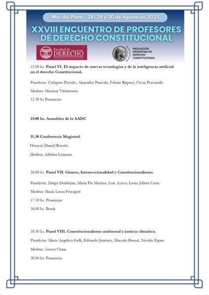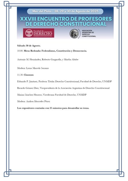 Finalmente, el sábado 30 tendrá lugar una mesa redonda sobre federalismo, constitución y democracia, que contará con la participación de reconocidos académicos como Antonio M. Hernández, Roberto Gargarella y Martha Altabe. El cierre estará encabezado por Eduardo Jiménez, profesor titular de Derecho Constitucional en la UNMDP; Ricardo Gómez Diez, vicepresidente de la AADC; y Marina Sánchez Herrero, vicedecana de la Facultad de Derecho.