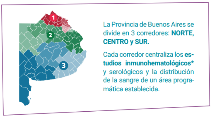 Cada corredor tiene su Centro Regional de Hemoterapia de referencia, en el Corredor Sur este centro está en Mar del Plata (Estado de Israel 3698). Mientras que en el Corredor Norte, en 3 de Febrero y en el Corredor Centro, en La Plata. Los CRH reciben la sangre donada y se ocupan de su estudio, producción y distribución, interviniendo en todos los procesos en pos de la seguridad transfusional: la donación, la preparación de los productos sanguíneos y la posterior transfusión.
