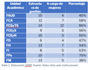 - Gobierno Unidades Académicas: 3 de 10 Decanas (30%) y 5 de 10 Vicedecanas (50%). El 80% de las fórmulas de conducción están integradas por mujeres.