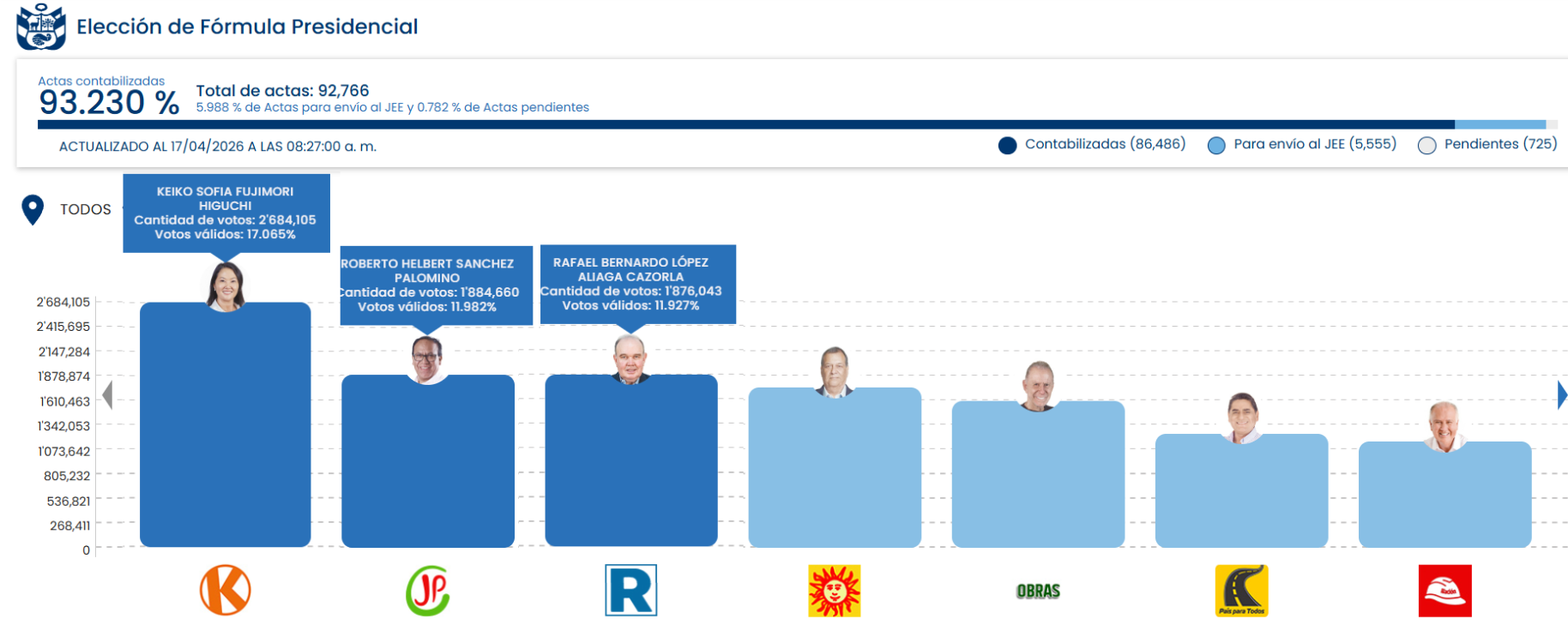La incertidumbre sobre el segundo candidato que acompañará a Fujimori en la segunda vuelta sintetiza el escenario político actual. La diferencia entre los principales competidores es mínima y mantiene abierto el resultado final, en una elección donde cada voto adquiere un peso decisivo.
