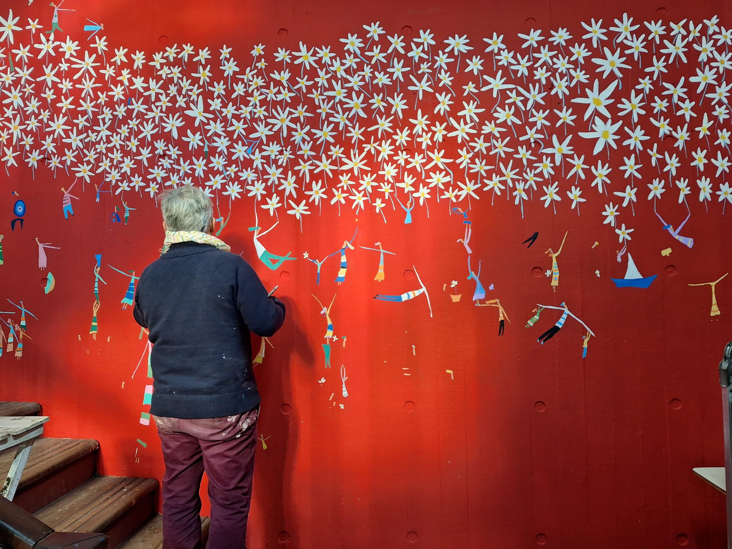 Acerca del proceso de creación en el que recibe la colaboración del artista Juan Manuel Rosas, Giménez explicó que ‘’son procesos muy simples’’, y qué ‘’Aparece y ahí voy, lo hago. Me pregunté para qué lado ir, y realmente vi las margaritas y vi a todo el mundo compartiendo, tenía ganas de hacerlo.’’ El espacio elegido, una de las escaleras de la sede de la Facultad de Humanidades, se convirtió para el artista en una fuente de energía: ‘’Vos podés estar pasando por acá y en una mirada, o leyendo el título, quizás te acerca a un momento, o te lleva a una reflexión’’, concluyó Felipe Giménez.