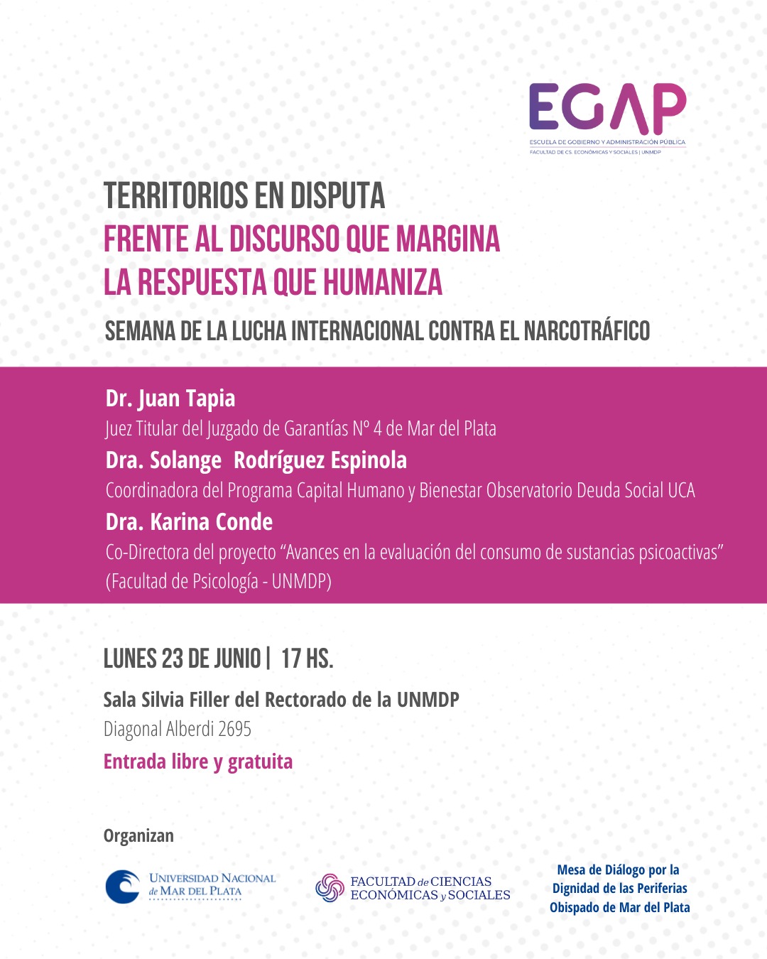 En el marco de la Semana Internacional de la Lucha Contra el Narcotráfico, la Escuela de Gobierno y Administración Pública (EGAP) de la Facultad de Ciencias Económicas y Sociales de la Universidad Nacional de Mar del Plata, en conjunto con la Mesa de Diálogo por la Dignidad de las Periferias, dependiente del Obispado de Mar del Plata, invita a participar de la disertación titulada “Territorios en disputa: frente al discurso que margina, la respuesta que humaniza”.